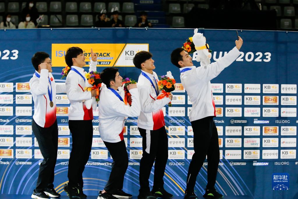 当日,在韩国首尔进行的2023年短道速滑世锦赛男子5000米接力决赛中,中国队以7分04秒412的成绩获得冠军。