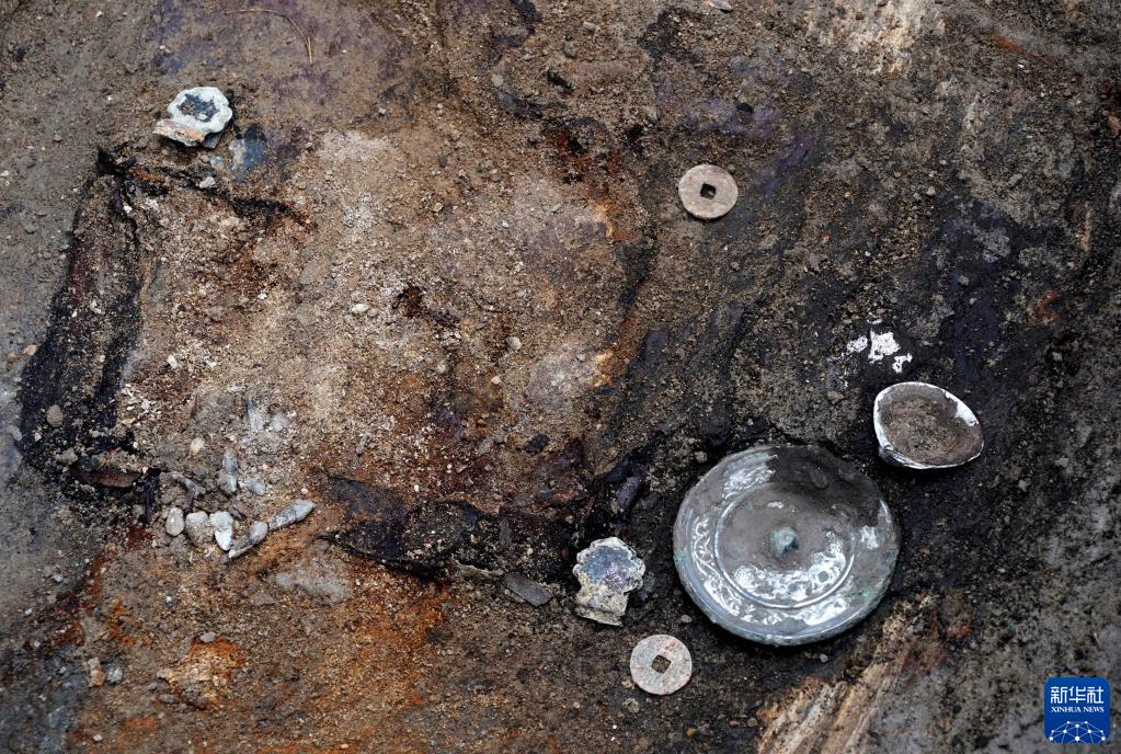 这是宋国故城遗址内的唐代墓葬出土的铜钱、铜镜等(3月25日摄)。新华社记者 李安 摄