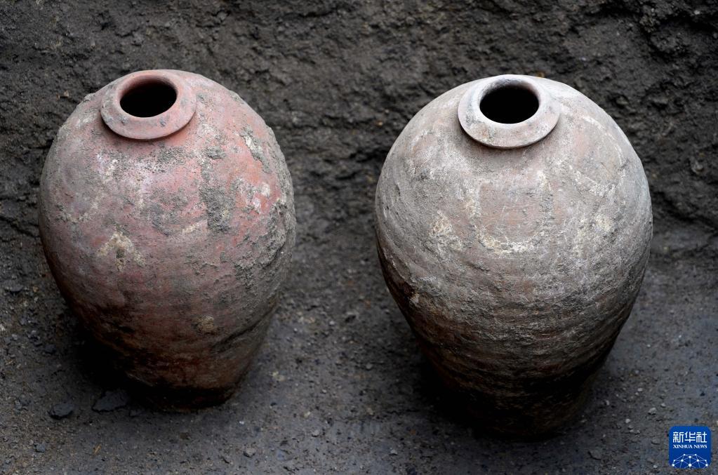 这是宋国故城遗址内的唐代墓葬出土的陶罐(3月25日摄)。新华社记者 李安 摄