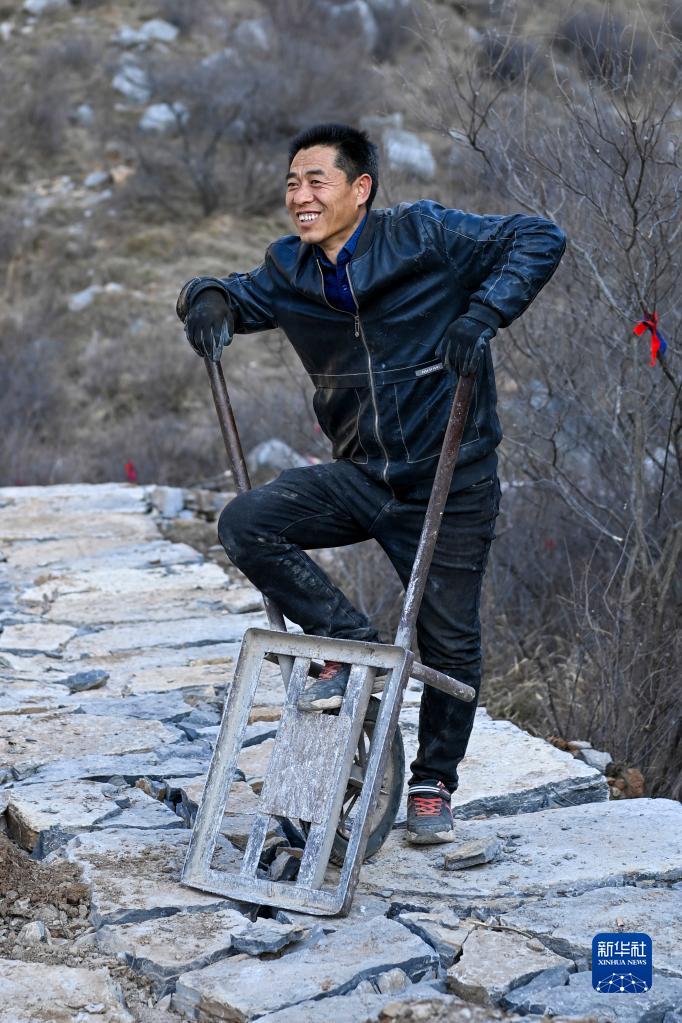 在位于山西省壶关县大峡谷镇青龙峡村的太行山上,牛何松在修路间隙休息(3月7日摄)。新华社记者 杨晨光 摄