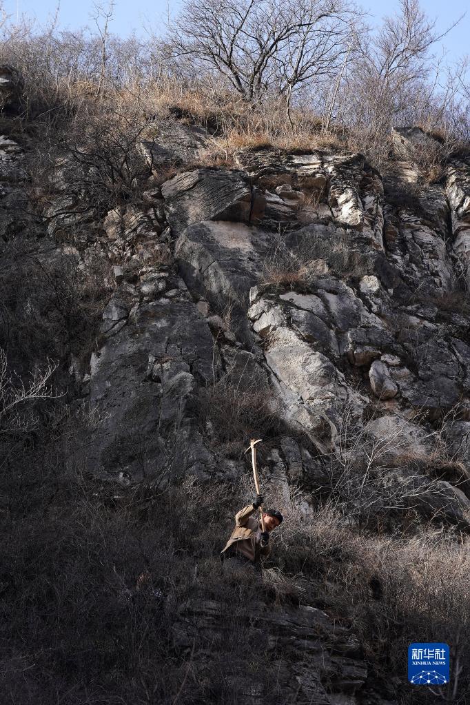 山西省壶关县大峡谷镇青龙峡村村民申森在清理路基上的杂物(3月8日摄)。新华社记者 詹彦 摄