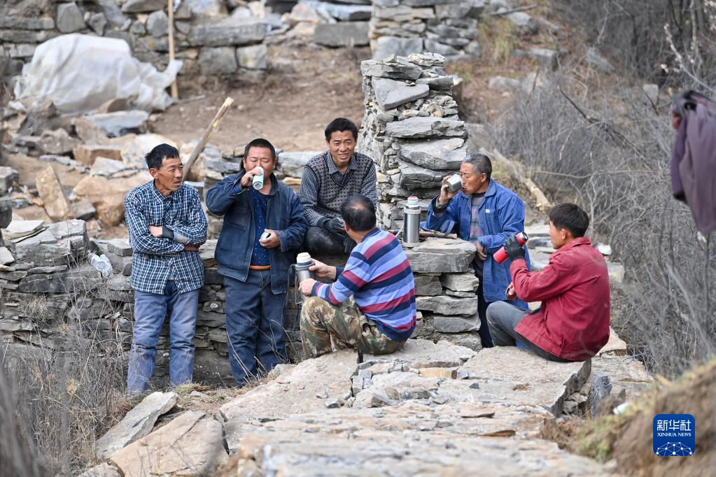 在位于山西省壶关县大峡谷镇青龙峡村的太行山上,村民在修路间隙喝水休息(3月23日摄)。新华社记者 杨晨光 摄