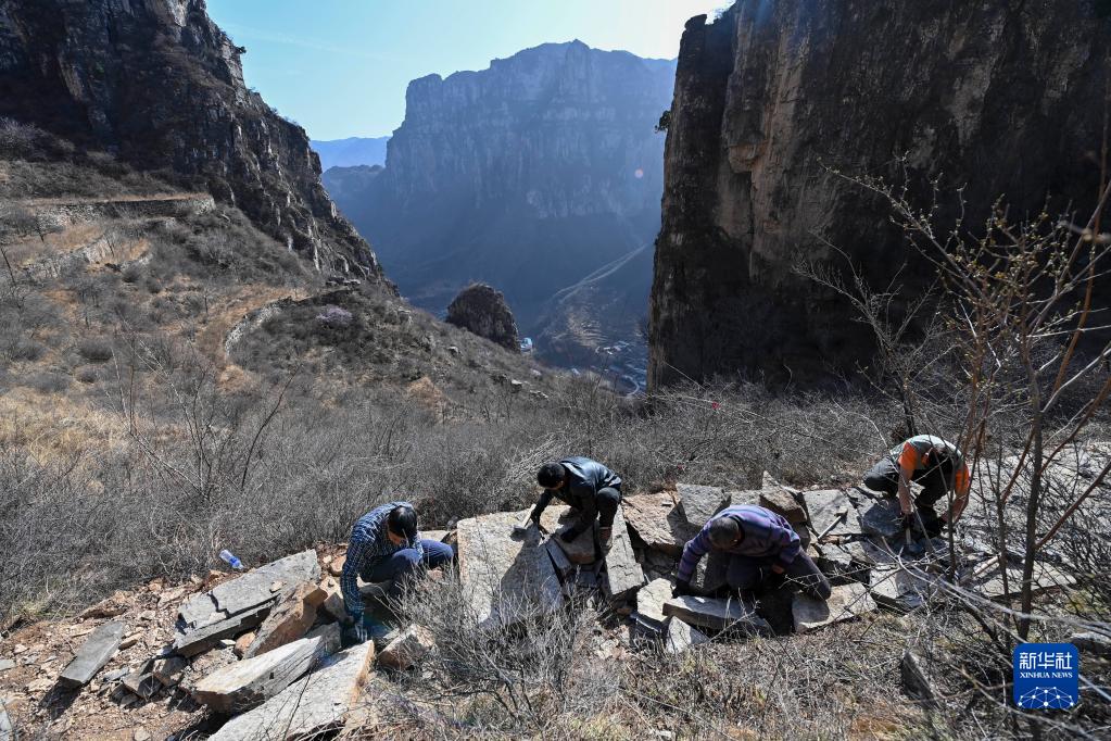 村民在位于山西省壶关县大峡谷镇青龙峡村的太行山上修路(3月8日摄)。新华社记者 杨晨光 摄