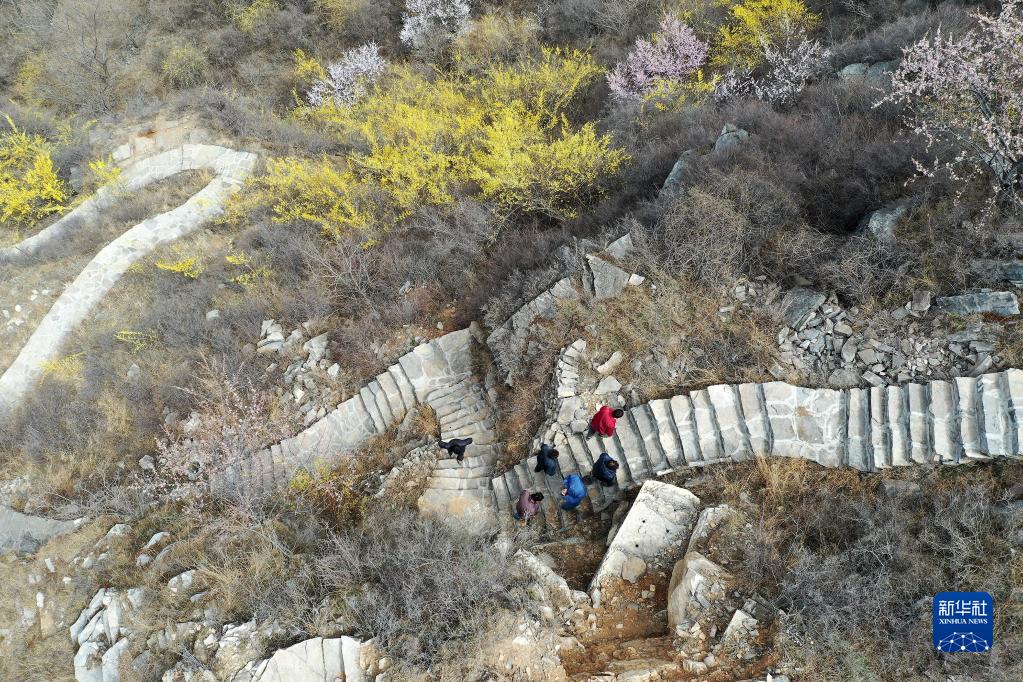 在壶关县大峡谷镇青龙峡村,村民们走在修好的旅游步道上(2023年3月23日摄,无人机照片)。新华社记者 詹彦 摄