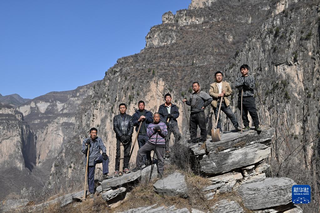 修路的部分村民在山上合影,从左至右为王春勤、牛何松、张卫国、王成生、牛丽朋、牛永刚、申森、牛慧凯(3月8日摄)。新华社记者 詹彦 摄