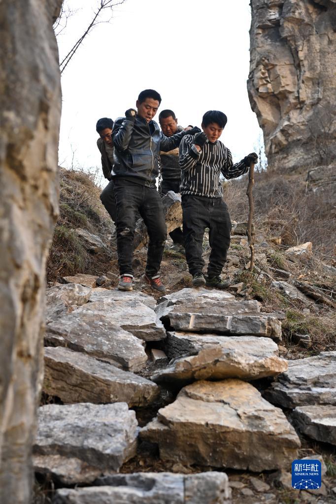在位于山西省壶关县大峡谷镇青龙峡村,村民挑着石块运往修路现场(3月7日摄)。新华社记者 杨晨光 摄