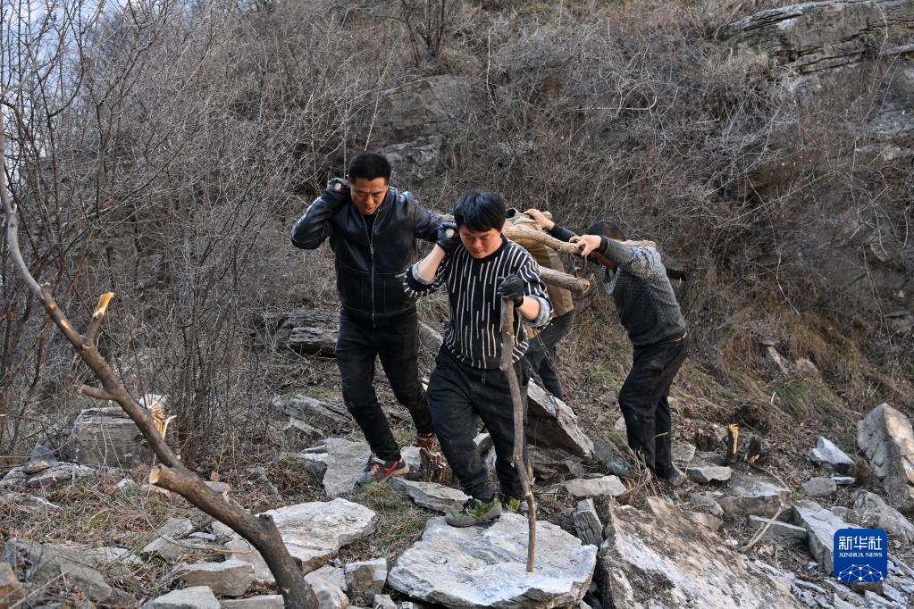 在位于山西省壶关县大峡谷镇青龙峡村的太行山上,村民挑着石块运往修路现场(3月7日摄)。新华社记者 杨晨光 摄