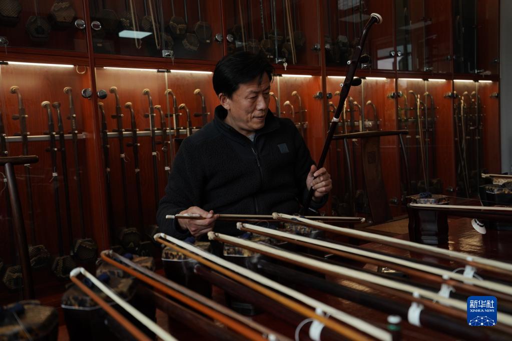 3月28日,制琴师卜广军在江苏无锡梅村街道二胡产业园古月琴坊车间调试二胡。