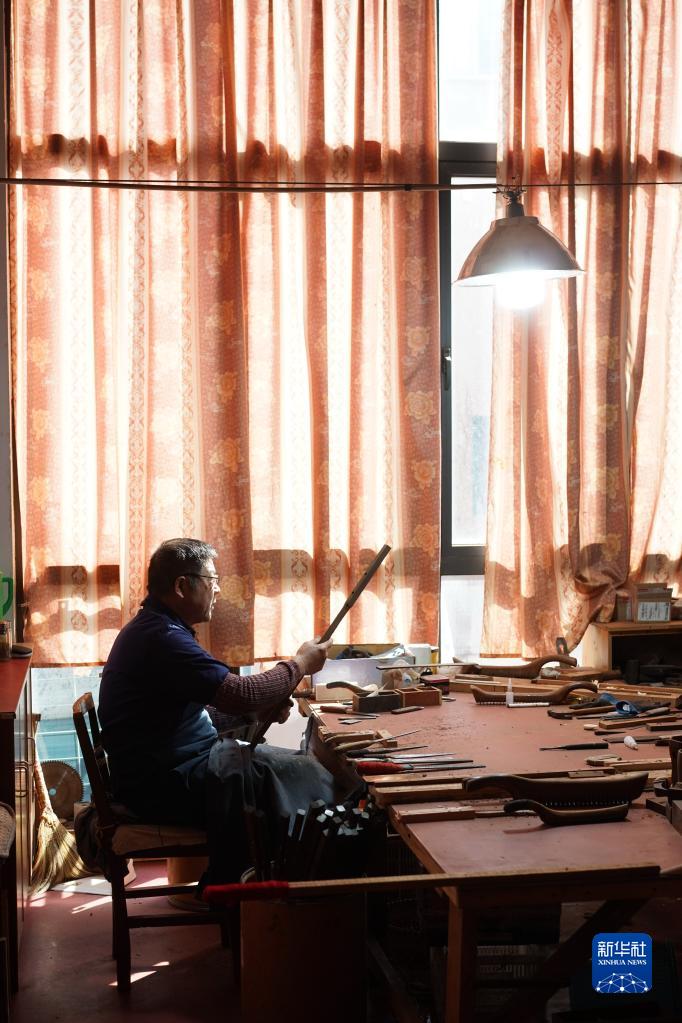 3月28日,在江苏无锡梅村街道二胡产业园古月琴坊车间,工人在制作二胡。
