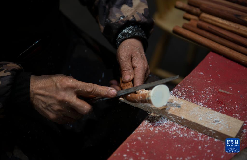 3月28日,在江苏无锡梅村街道二胡产业园,工人在制作琴杆。