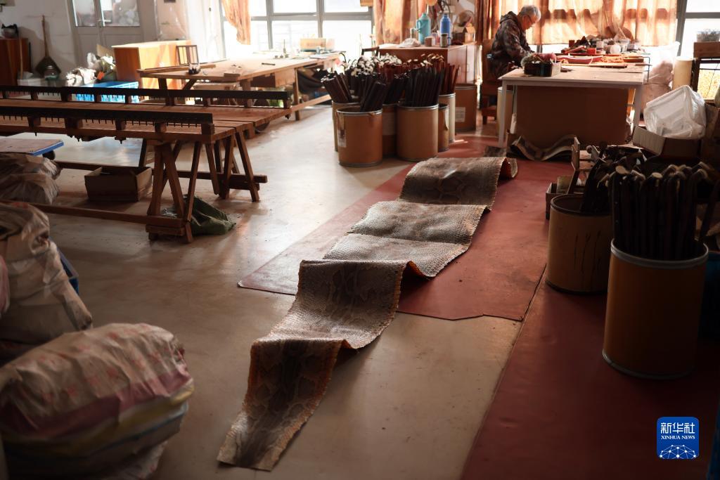 这是3月28日在江苏无锡梅村街道二胡产业园拍摄的制作二胡用的蟒皮。