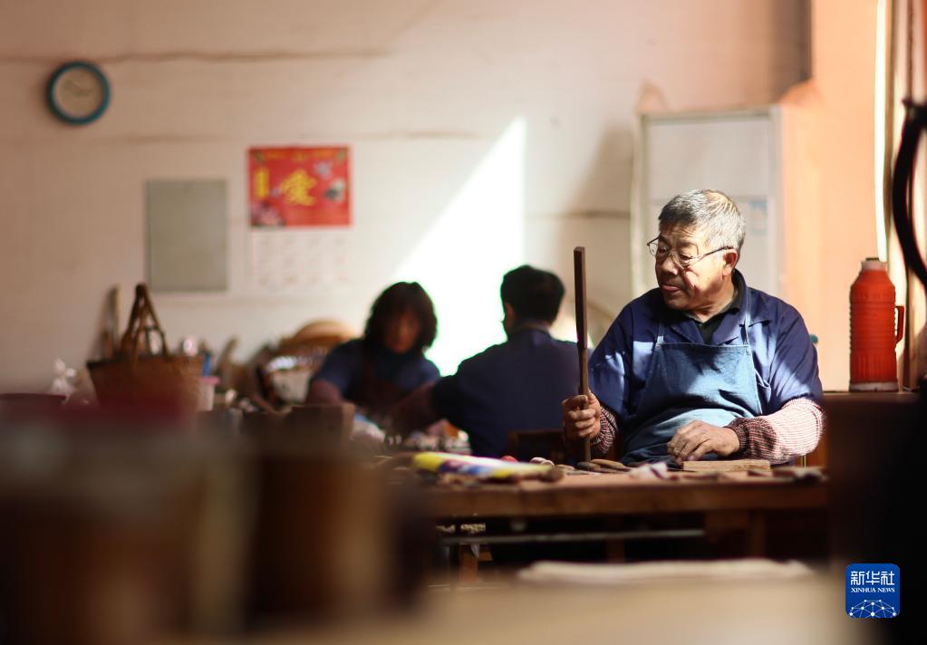 3月28日,在江苏无锡梅村街道二胡产业园,工人在制作琴杆。