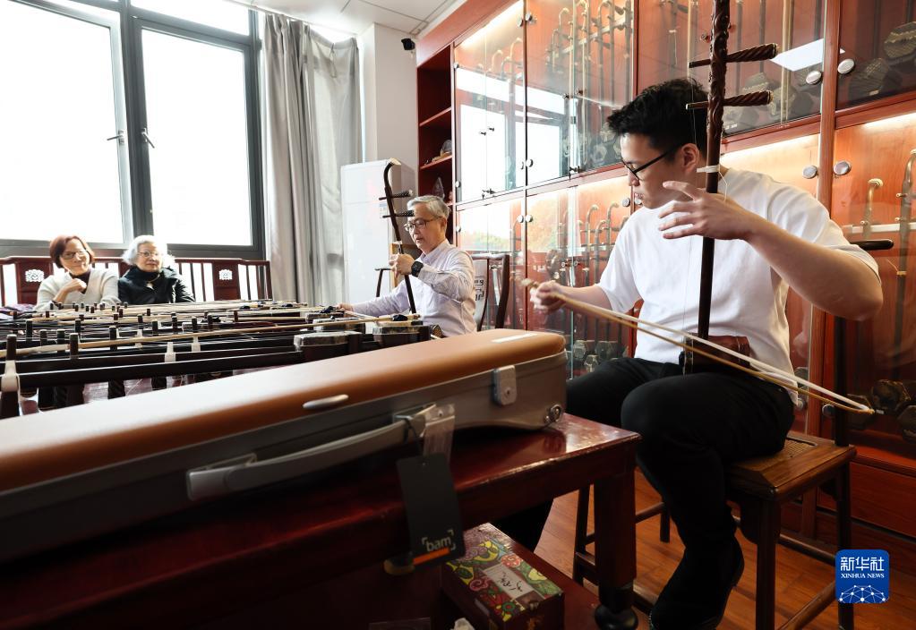 3月28日,在江苏无锡梅村街道二胡产业园,来自香港的乐器经销商李开(右二)和来自台湾的学生王彦翔(右一)共同演奏乐曲。他们专程前来挑选二胡。