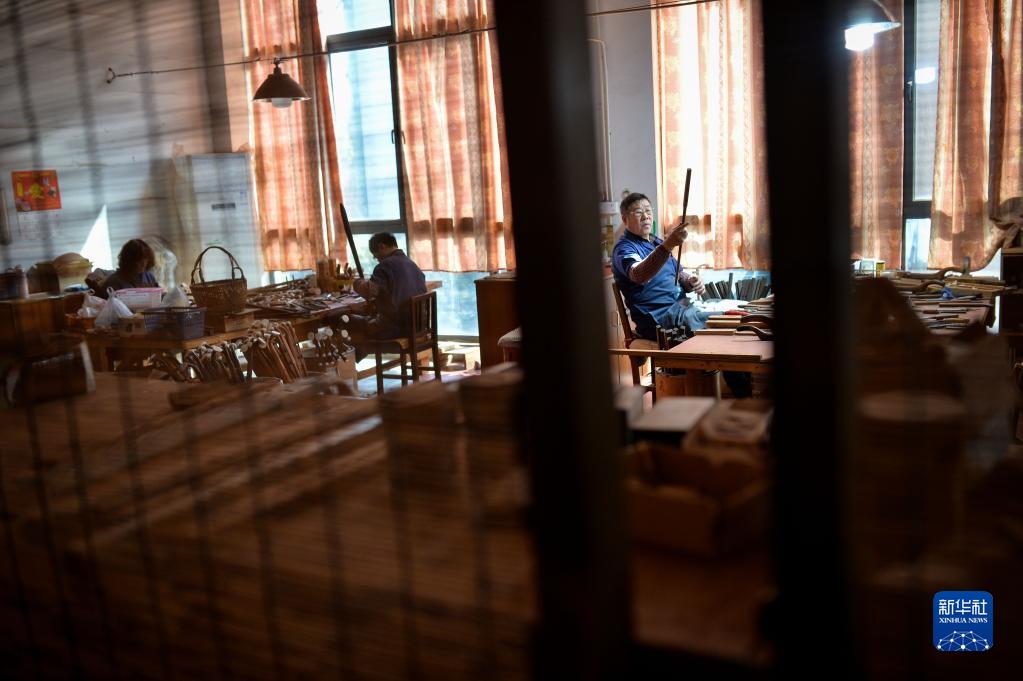 3月28日,在江苏无锡梅村街道二胡产业园,工人在制作二胡。