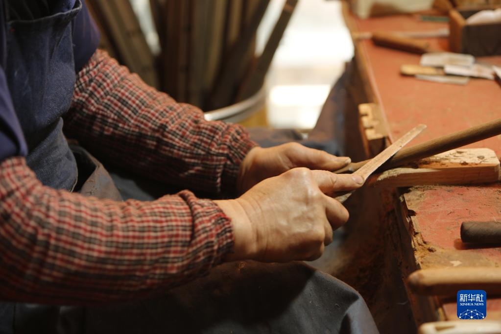 3月28日,工人在江苏无锡梅村街道二胡产业园古月琴坊打磨二胡琴杆。