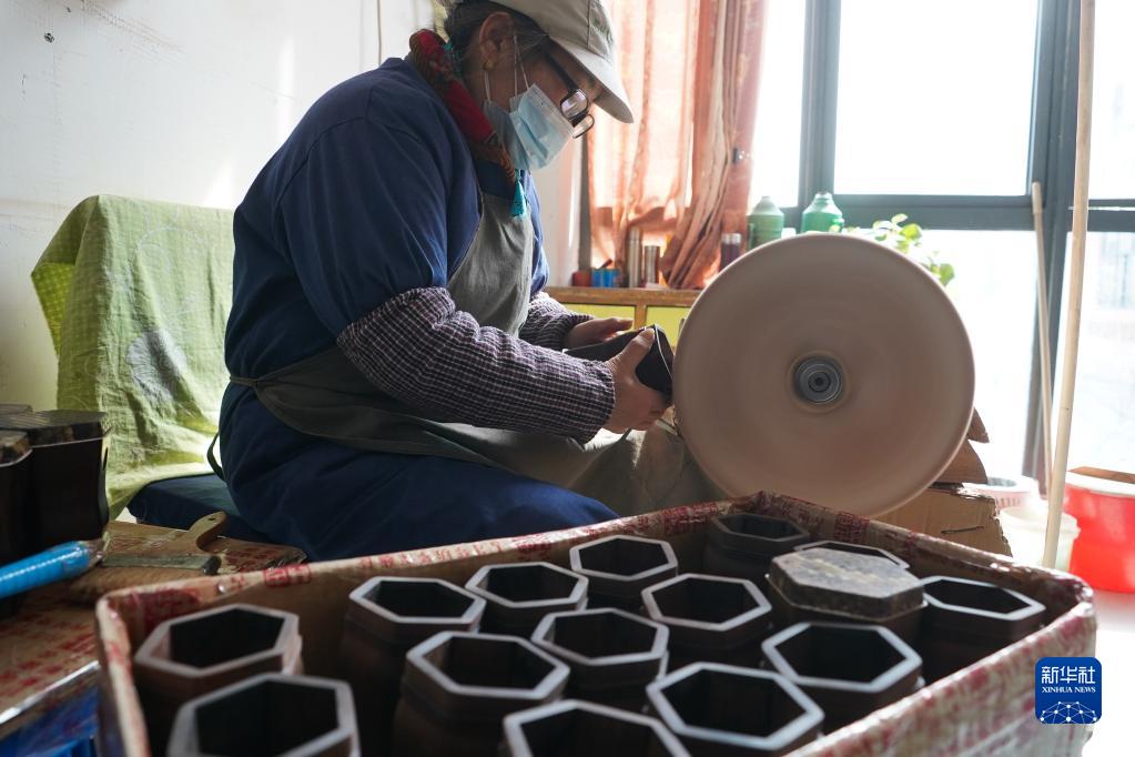 3月28日,在江苏无锡梅村街道二胡产业园古月琴坊车间,工人在对琴筒进行抛光。
