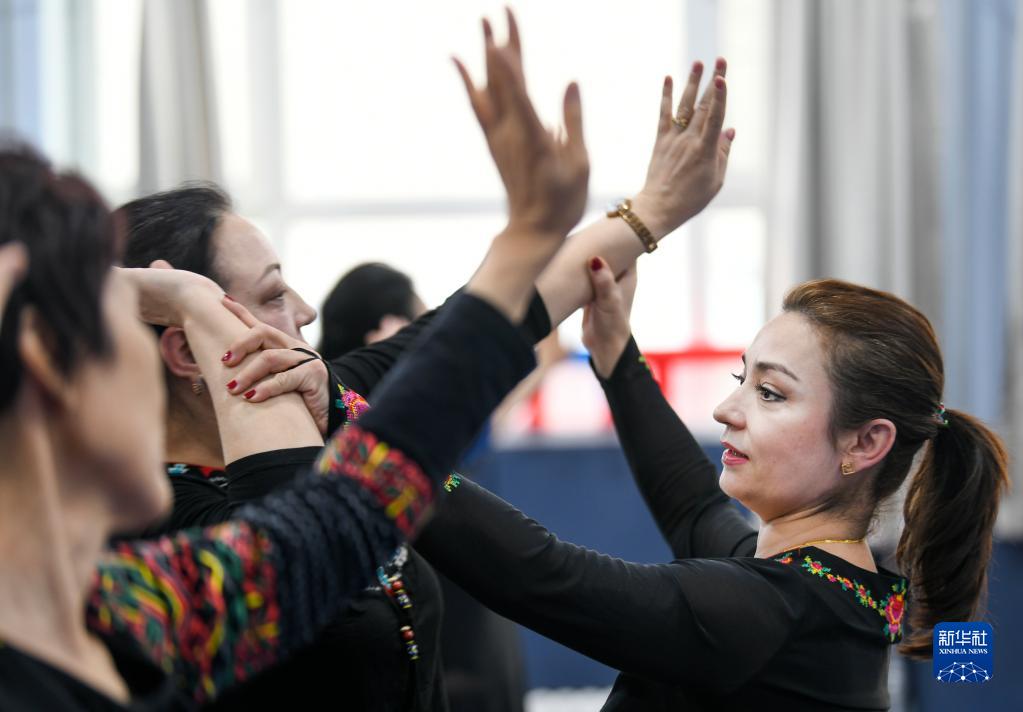 3月23日,舞蹈老师米拉(右)在民族舞课上纠正学员动作。