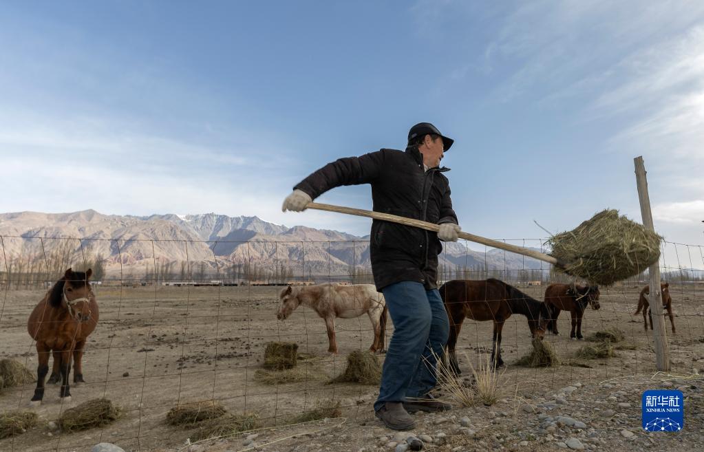 4月10日清晨,在阿合奇村,阿不都别克在喂马。