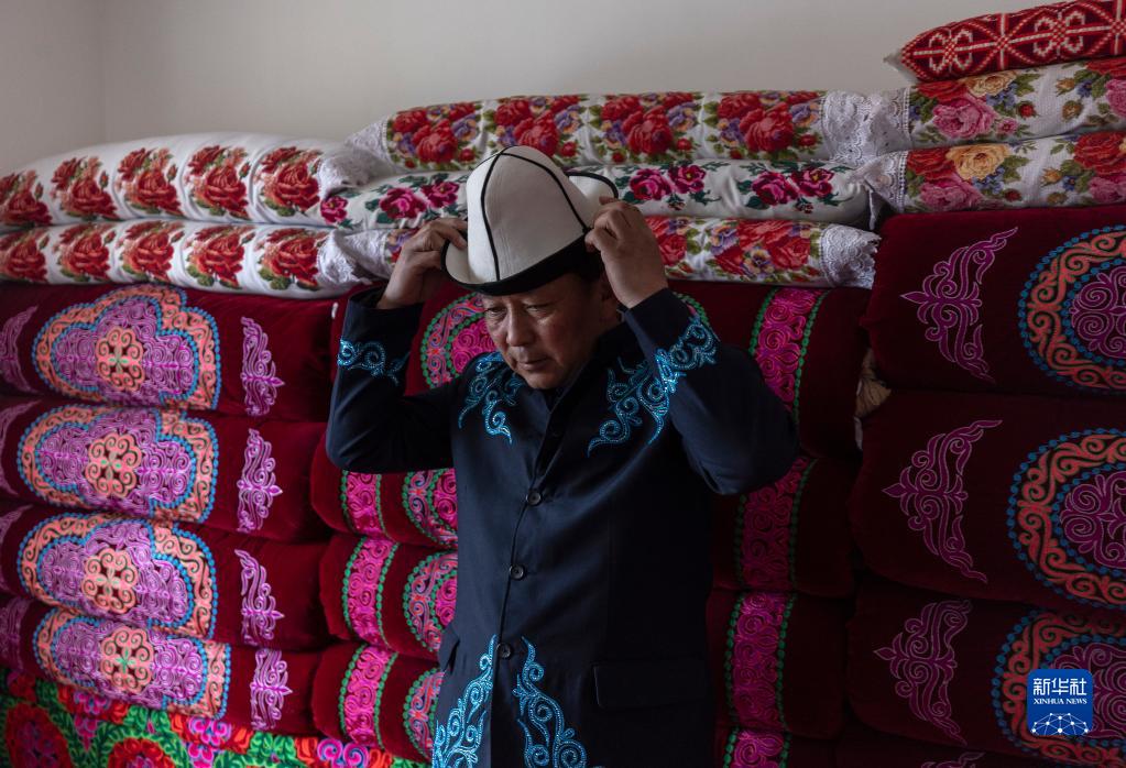 4月10日,在阿合奇村,阿不都别克穿上柯尔克孜族服装,准备去参加表演。