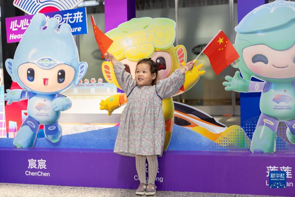 10月1日,小朋友在上海虹桥火车站候车区挥舞国旗。