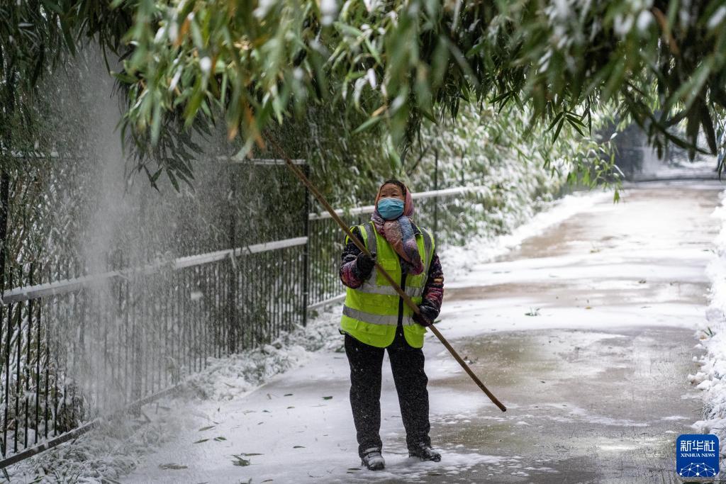 12月11日,园林工作人员在济南泉城公园清理树木积雪。