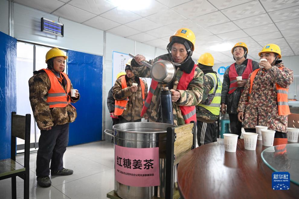 12月12日,在中建二局北方公司天津泰康项目工地,工人在饮用为他们准备的红糖姜茶驱寒。
