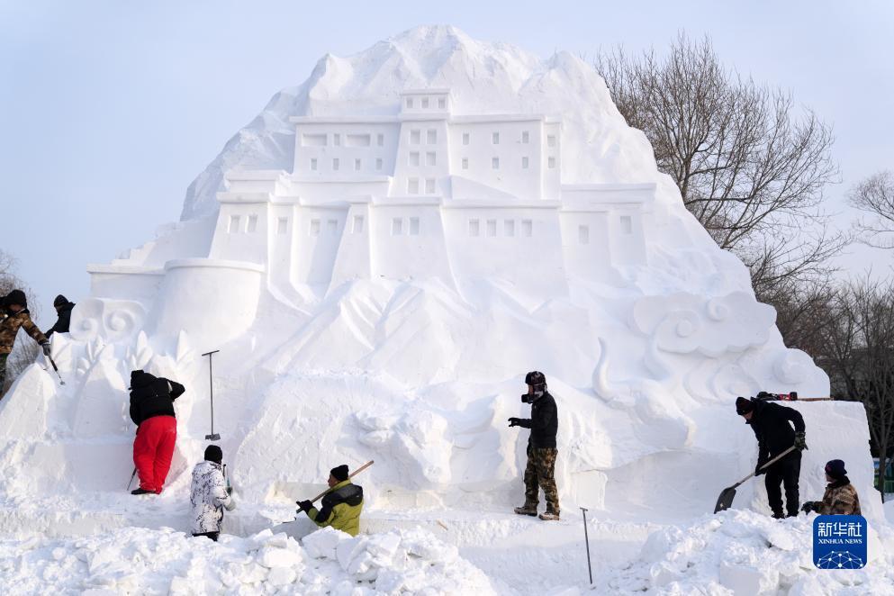12月12日,在哈尔滨太阳岛雪博会园区,雪雕师进行雪雕创作。