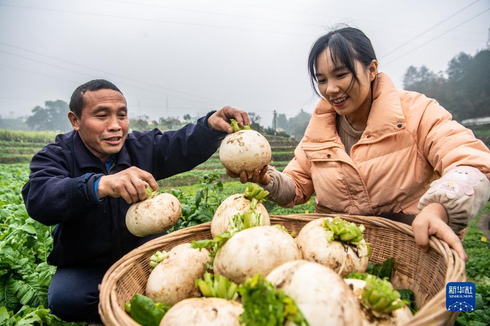 12月12日,在重庆市綦江区赶水镇石房村赶水萝卜种植园内,种植户在田地里收获萝卜。