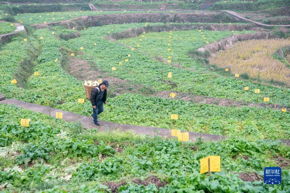 12月12日,在重庆市綦江区赶水镇石房村赶水萝卜种植园内,种植户背着收获的萝卜行走在田间。
