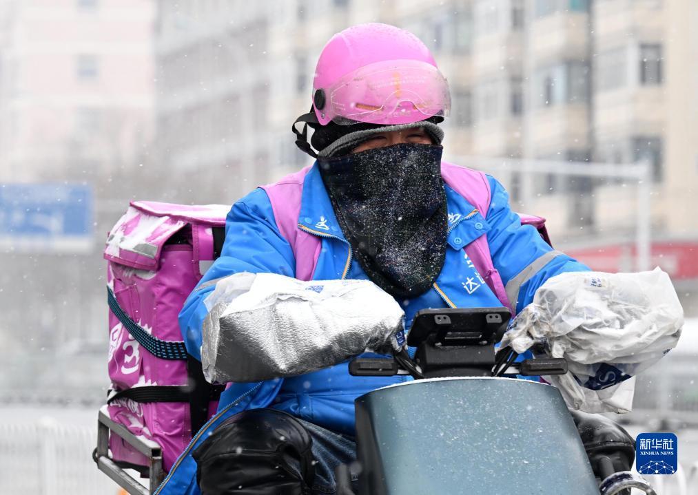 12月13日,在天津市南开区,一名外卖骑手身着御寒装备在骑行途中。