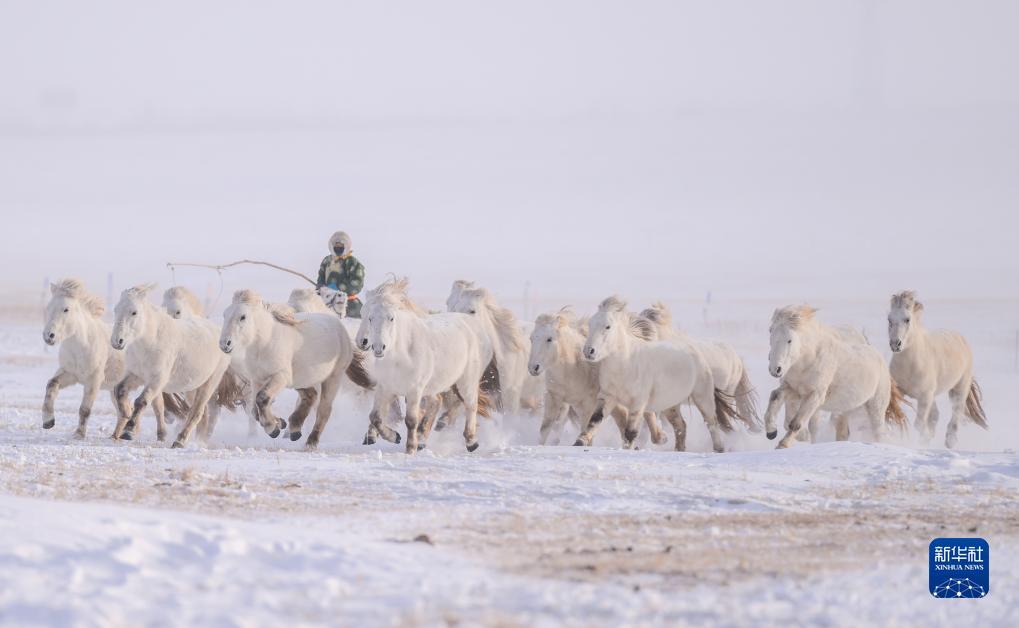 12月20日,内蒙古锡林郭勒盟西乌珠穆沁旗的牧民在雪原上驯马。
