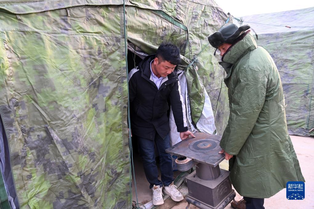 12月20日,在积石山县柳沟乡张郭家村,工作人员为受灾群众分发火炉。