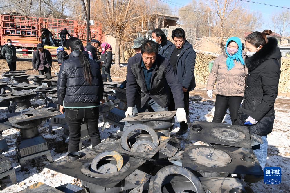 12月20日,在积石山县石塬镇沈家坪村安置点,受灾群众领取火炉。