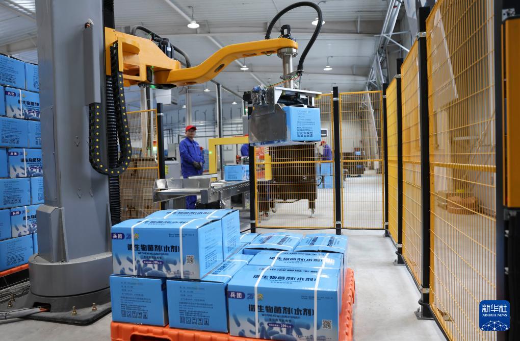 12月21日,在新疆生产建设兵团第六师五家渠市一家生物科技企业的灌装车间,智能设备在搬运产品。