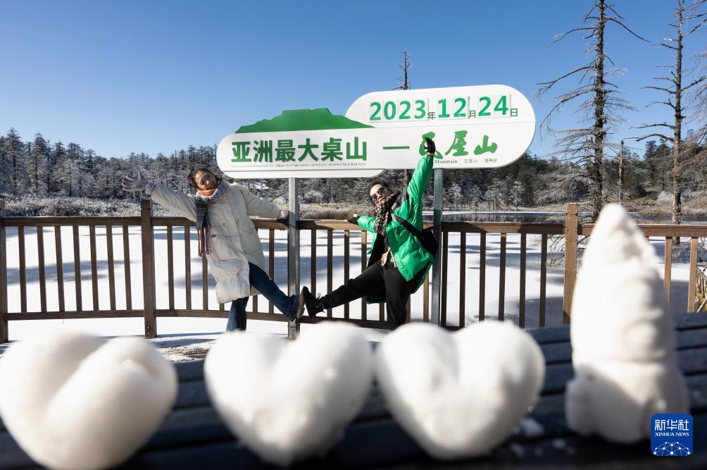 12月24日,两名游客在瓦屋山山顶的鸳鸯池边留影。