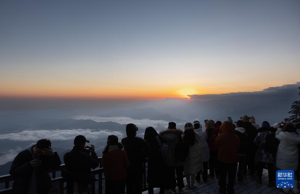 12月24日,游客在瓦屋山山顶欣赏日出和云海。