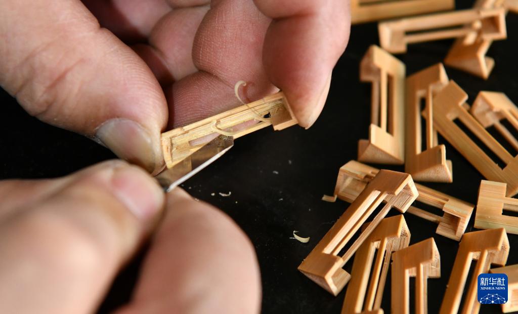 12月24日,三弦制作艺人在河北省肃宁县一家民族乐器生产企业车间内制作三弦琴码。