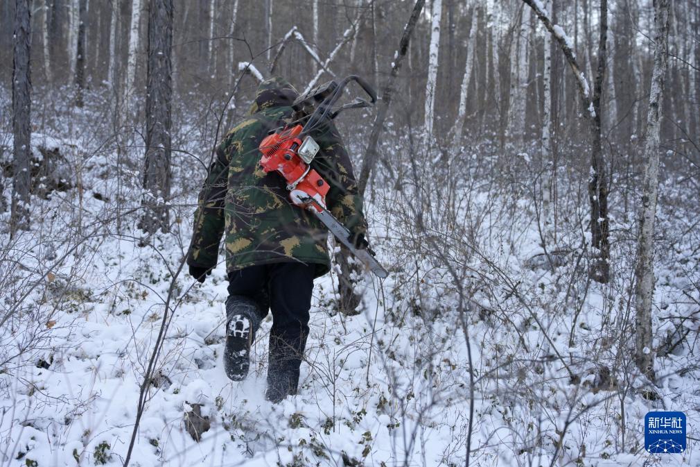 12月24日,在黑龙江省漠河市北极镇北极村周边一处作业点,漠河林场工作人员走在营林作业的路上。