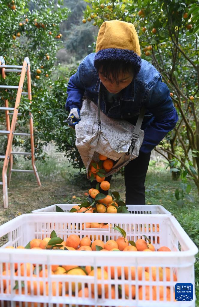 12月25日,在广西百色市乐业县新化镇百坭村,当地村民将刚刚采摘的砂糖橘倒入筐里。