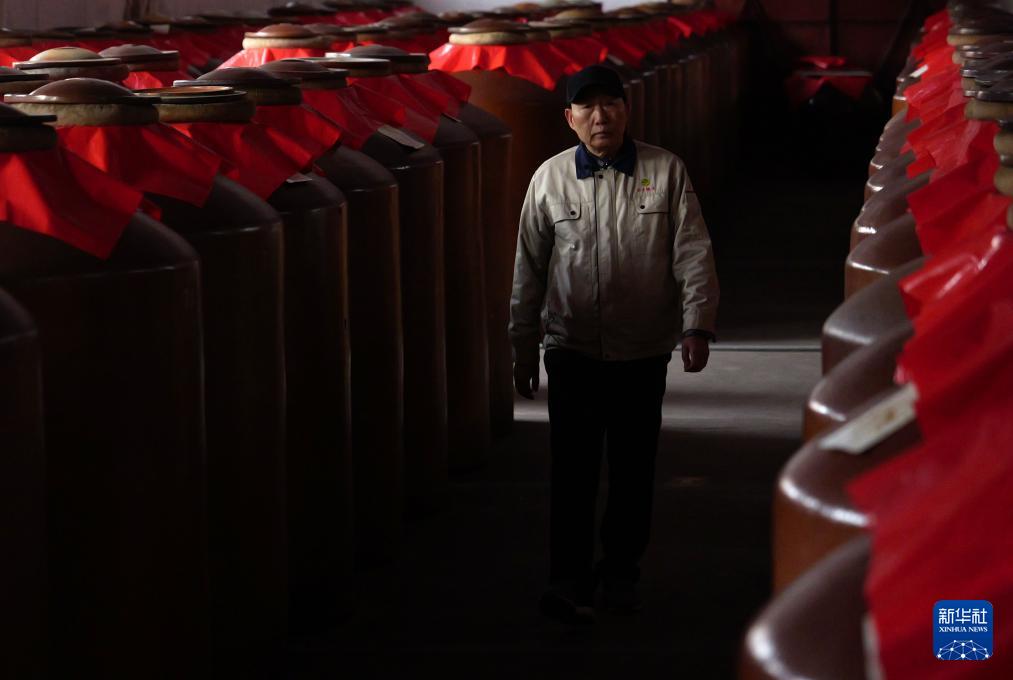 12月21日,非遗传承人卢振营在河南省宝丰酒业有限公司陶坛储酒库察看原酒储存情况。