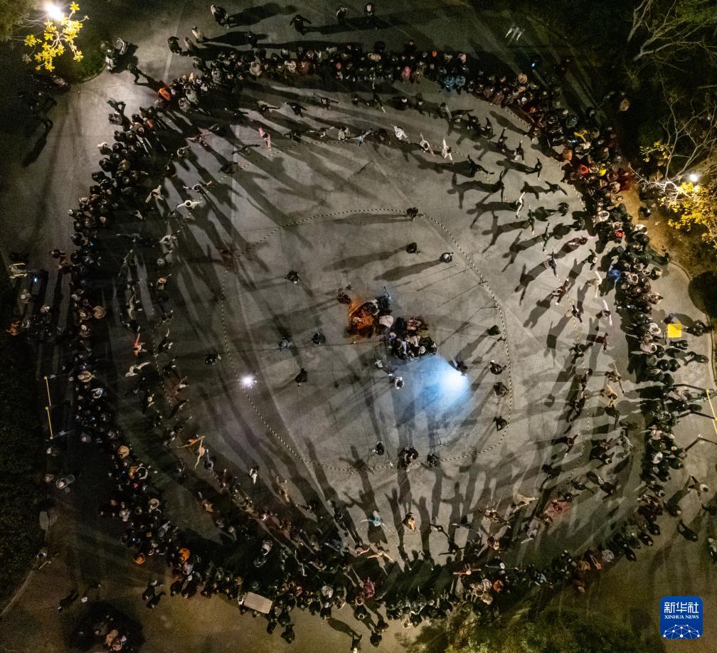 人们在成都锦外中心附近的广场上跳锅庄(无人机照片,12月16日摄)。