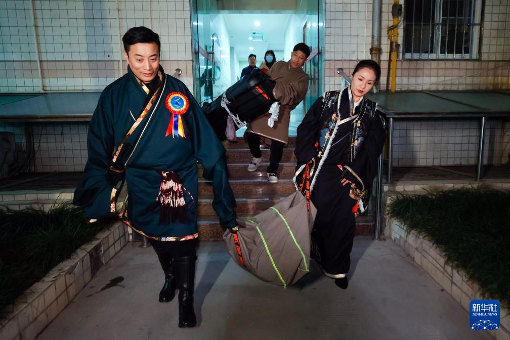 雍吉(右)和洛桑日者(左)、扎西泽仁(中)将音箱、电源线等设备搬往成都锦外中心附近的广场,为即将开始的锅庄舞会做准备(12月16日摄)。