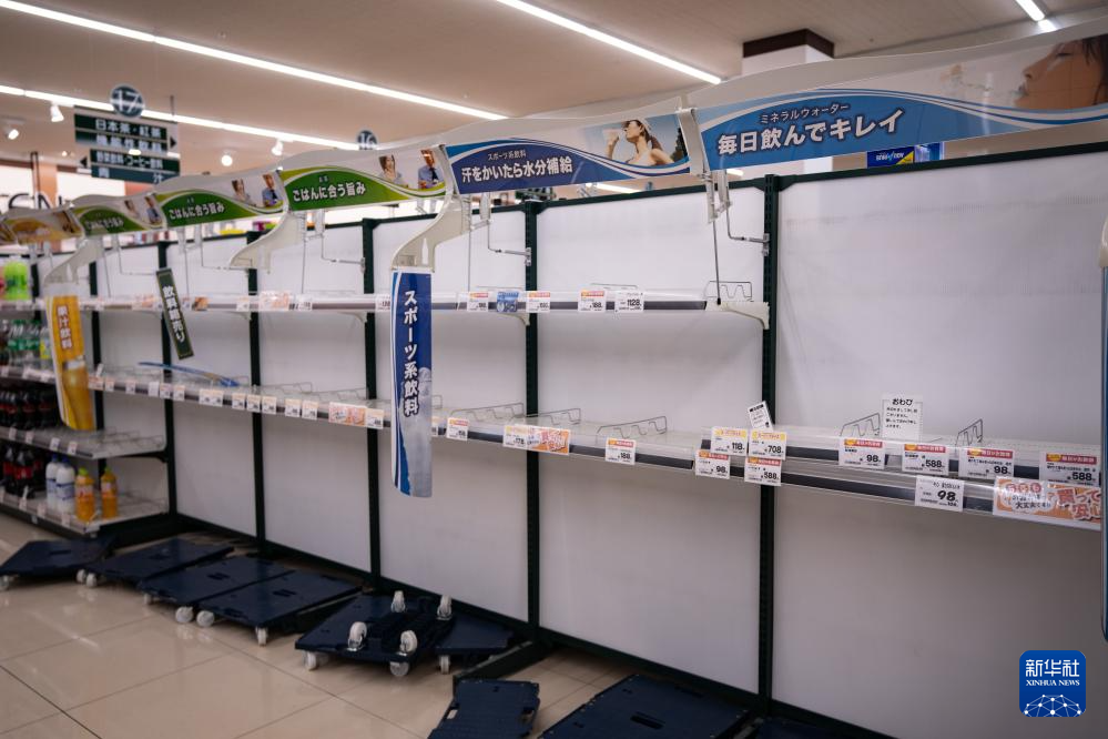 这是1月2日在日本石川县羽咋郡一家大型超市拍摄的饮料货架。超市部分物资发生短缺。