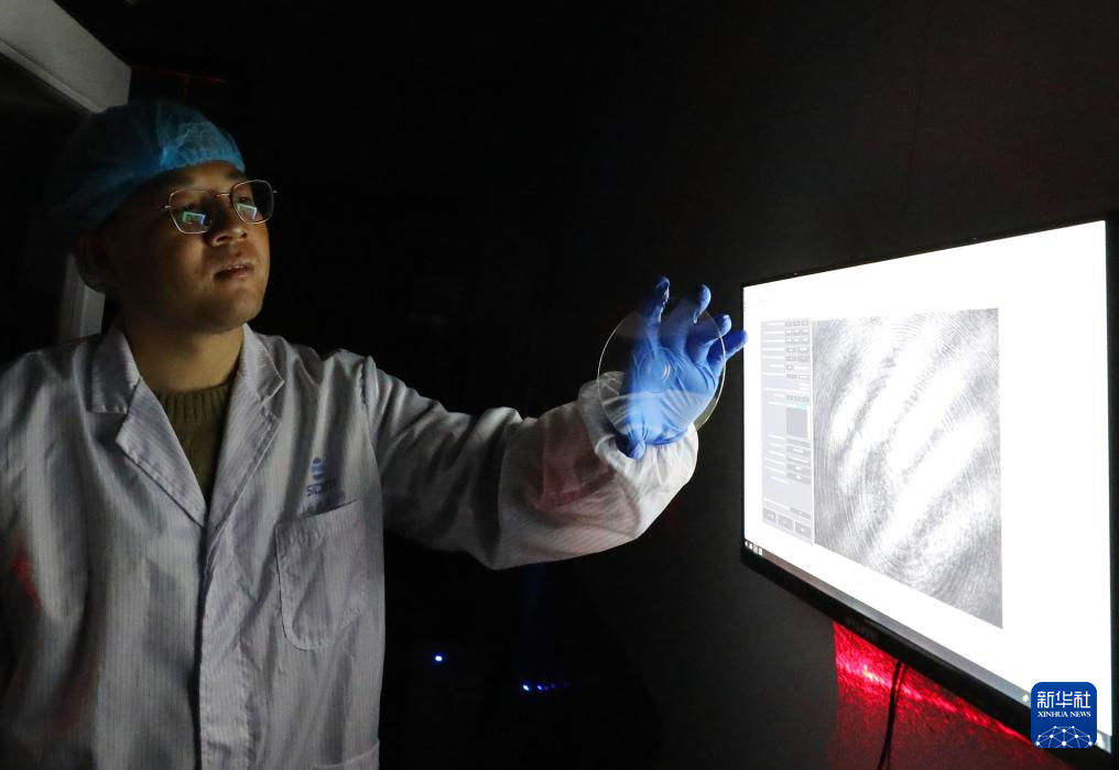 赵苗博士在上海光机所光学实验室向记者展示“超级光盘”(2月29日摄)。