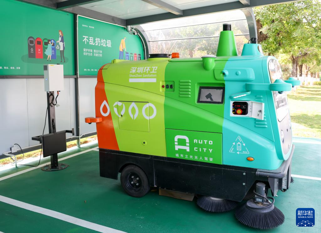 3月19日,在深圳市坪山区坑梓街道,环卫机器人完成清扫工作后回到基站进行无线充电。