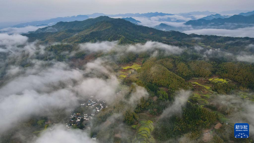 雨后初霁,位于安徽省黄山市徽州区呈坎镇的灵山村出现云海景观,缥缈的云雾与徽派民居、梯田花海相映成趣,美不胜收。