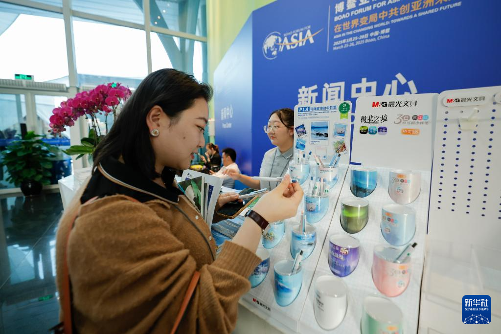 3月26日,在博鳌亚洲论坛2025年年会新闻中心,一名媒体工作者在领取可降解按动中性笔。