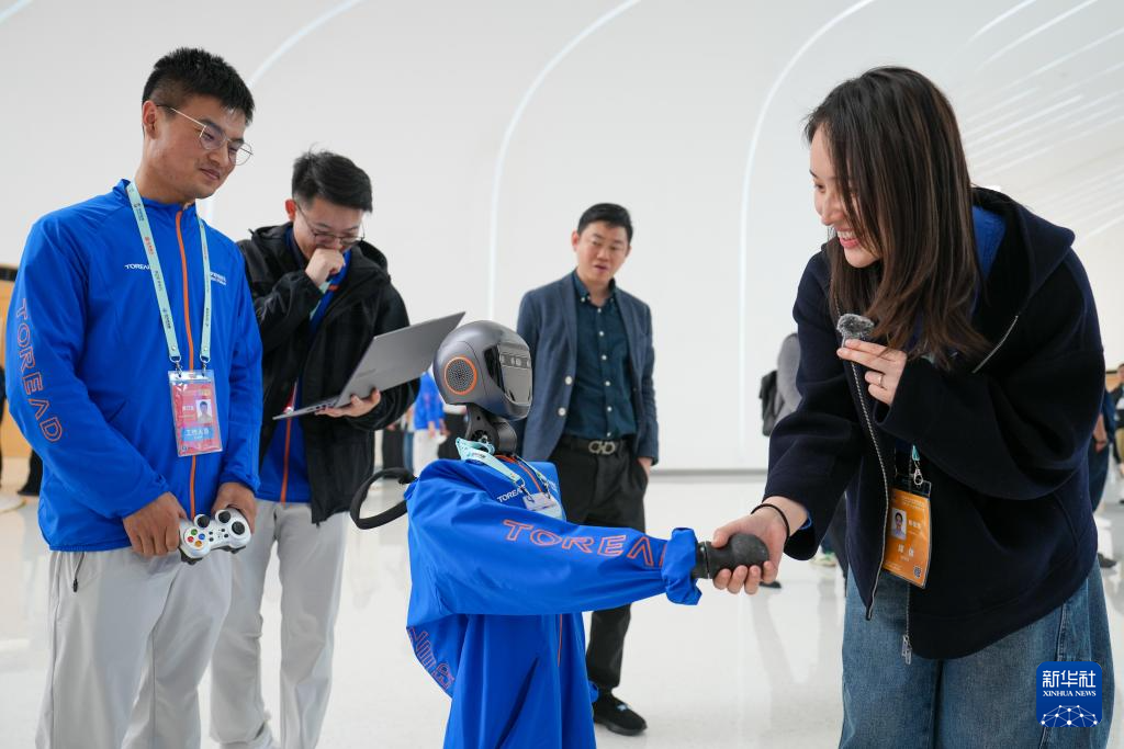 3月27日,在中关村国际创新中心,一款名为“加速T1”的人形机器人在与一位记者握手互动。