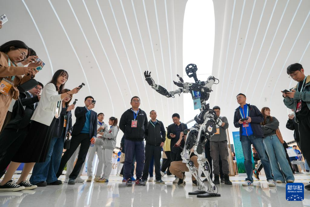 3月27日,在中关村国际创新中心,与会嘉宾和记者在观看一款名为“Adam”的人形机器人表演太极拳。