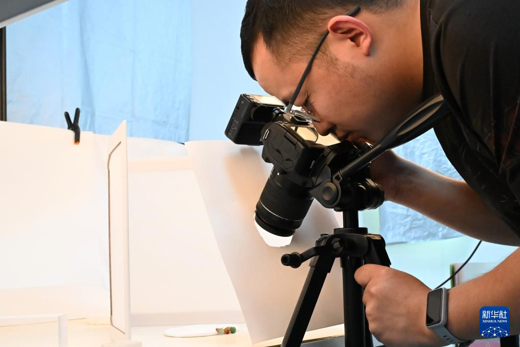 3月26日,在永嘉县桥头镇的一家钮扣公司,工作人员在拍摄钮扣宣传图。